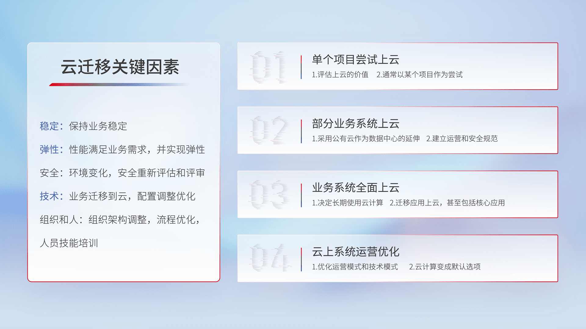 结合实际业务,,,,从规划设计、、云平台选型、、云原生改造、、、数据迁移、、集成交付,,迁移全过程为客户识别最佳上云路径,,,,做好风险识别管理,,,设计网络架构、、、、身份权限、、、、安全审计合规、、操作审计、、、、日志审计、、、、监控告警策略、、、、多站点容灾设计等,,,,对云上基础设施进行整体规划,,,提升IT治理水平,,,以满足弹性、、高可用、、、高性能的需求。。