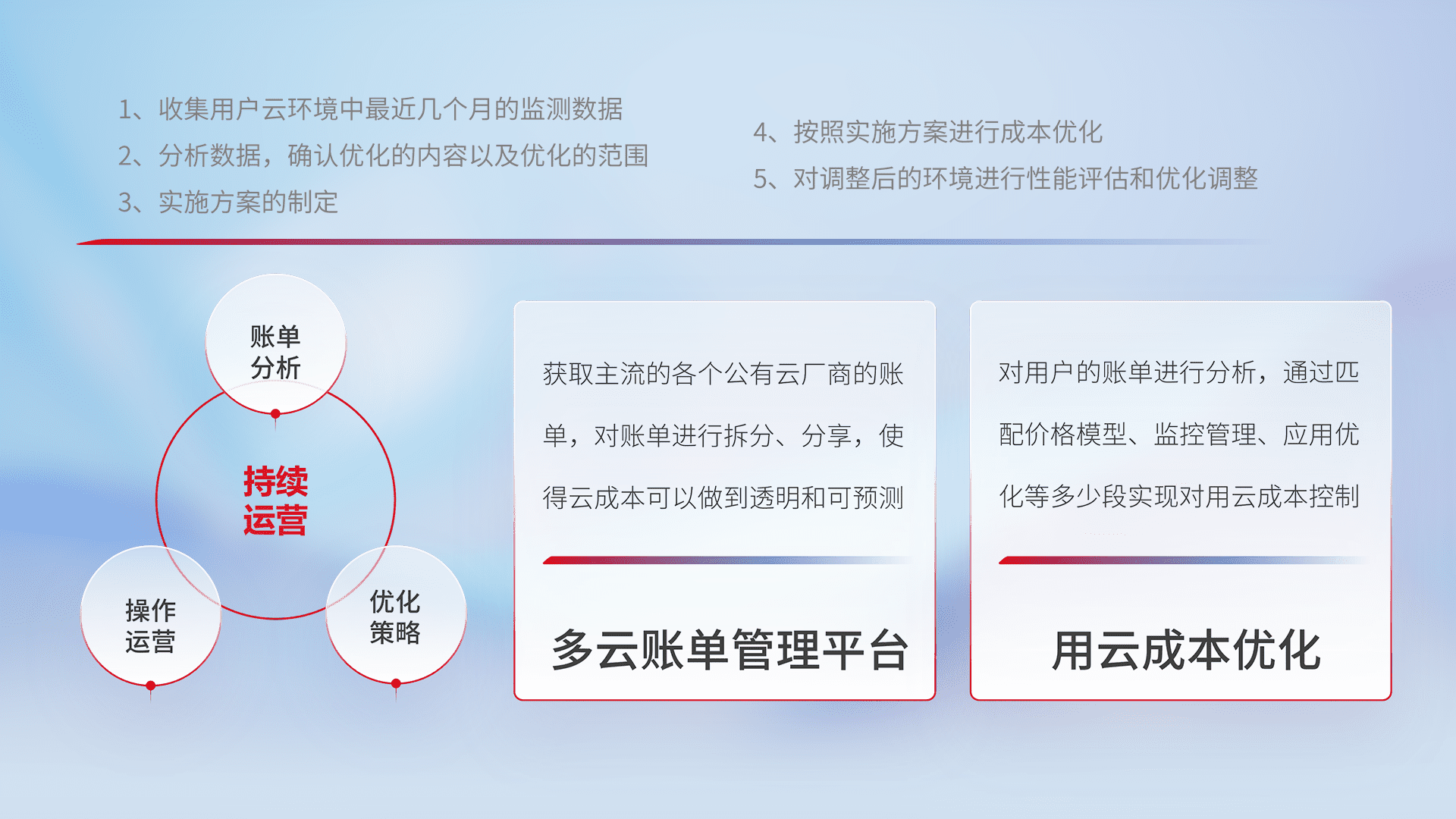 通过灵活运用多种自动化迁移工具,,,帮助企业用户实现业务和数据高效 、、、稳定的上云迁移和云上迁移,,采用自研多云纳管平台,,,以中立管理模式,,,解决多组织、、、、多云、、、、多运维厂商的复杂关系的管理,,,,保证多云平台资源配置的一致性,,,实时掌控云资源运行数据,,,,运用智能化工具分析云资源多云平台的管理服务,,,透明化管理成本支出,,用云成本可预测、、、用云费用可优化、、云资源配额有据可依。。