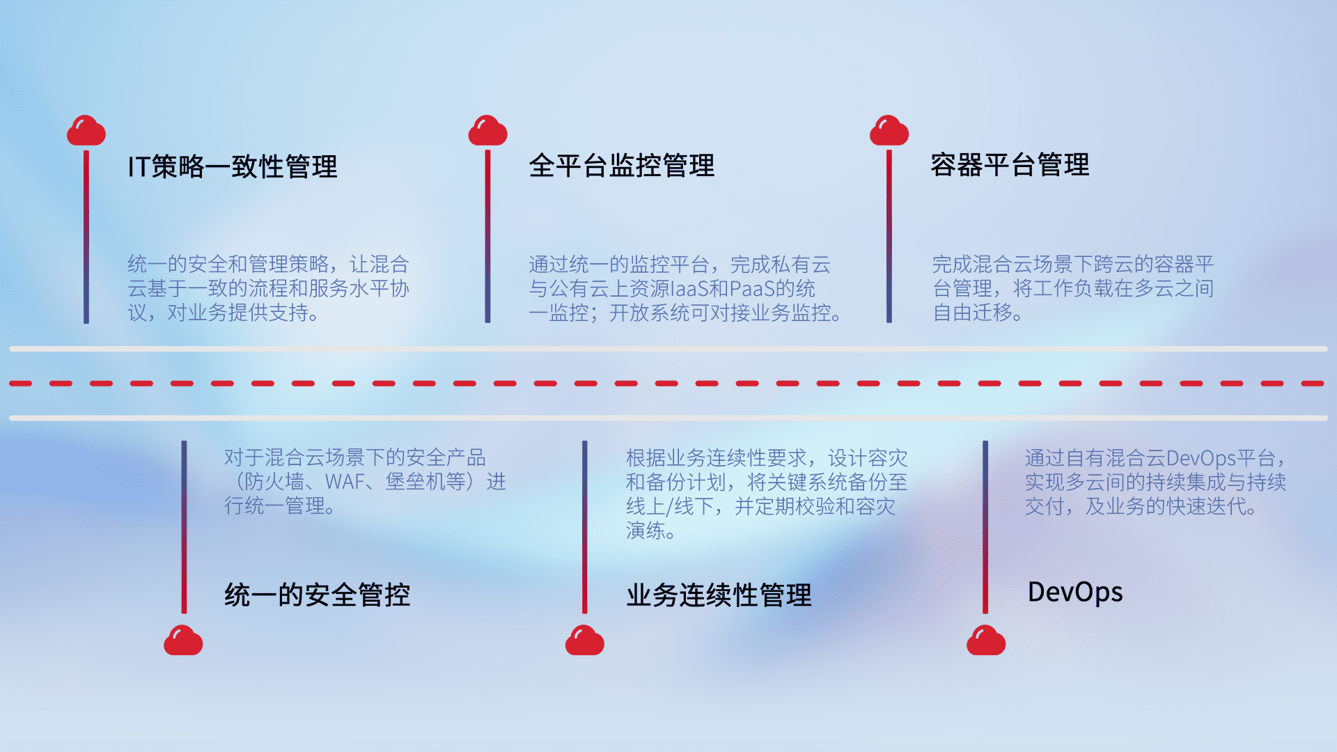 以中立管理模式,,解决多组织、、多云、、、多运维厂商的复杂关系的管理,,,,保证多云平台资源配置的一致性,,,实时掌控云资源运行数据。。