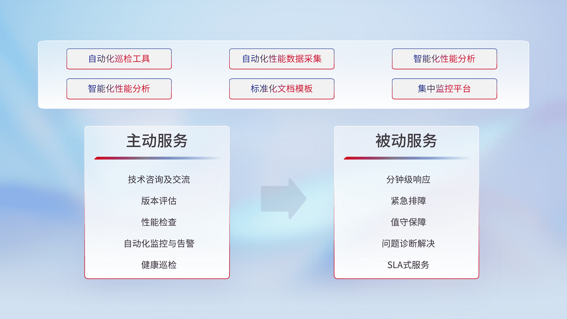 智能化工具和标准化文档,,,,保障服务质量,,提供主动服务(包含技术咨询、、、版本评估、、、、性能检查、、、自动化监控与告警、、健康巡检)和被动服务包含(分钟级响应、、紧急排障、、、值守保障、、、问题诊断解决、、SLA服务)。。。